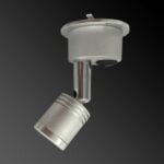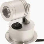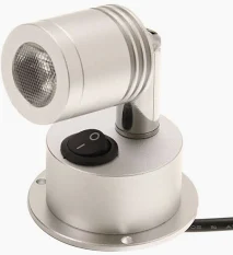 Compact silver reading light with built-in high-power warm white LED. 50mm diameter, 2W power, and adjustable pivot for precise spotlighting. 11-16V DC, with a small rocker switch. Ideal for mounting under shelves. 3-year guarantee.