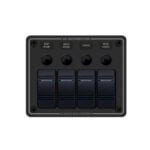 The Bluesea Systems Contura 8372 water resistant 4 position panel, is designed for open cockpit and flybridge applications, using switches to complement the existing controls commonly used on many boats. Its rugged design ideally handles above deck conditions including salt spray, rain, hose washdowns as well as momentary immersions, utilising its water tight mounting gasket. ON indicating LEDs are embedded in all switches. The panel can be used on both 12v and 24v systems, with a maximum operating voltage of 24v DC. Switch rating 20A @ 12v DC and 15a @ 24v DC. Its circuit breaker rating is 15A, and the fuse holder rating is 20A Max (15A fuses included)