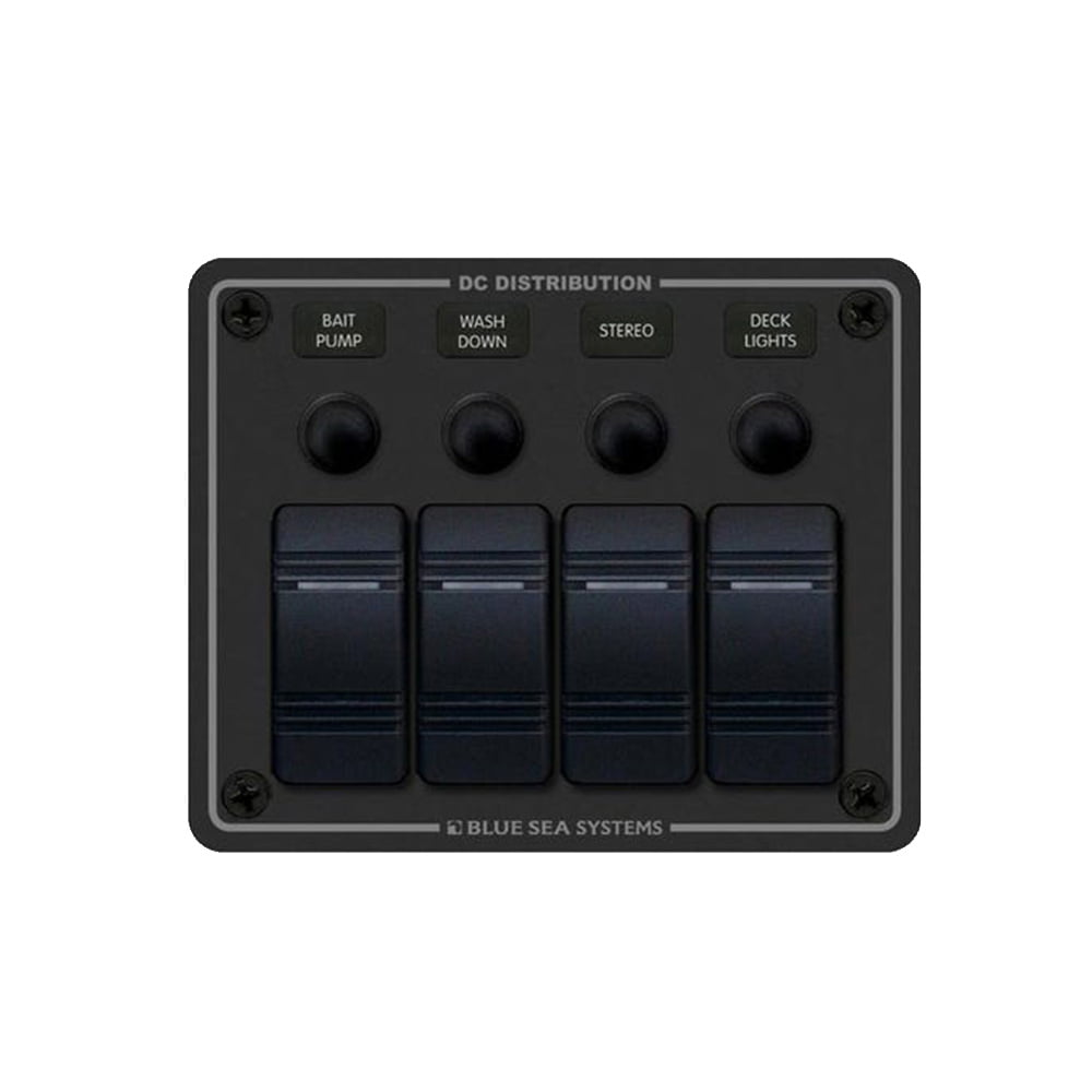The Blue Sea 8372 Water Resistant Circuit Breaker Panel is designed for marine and outdoor applications. It features four positions for circuit breakers, providing organized power distribution in a compact, water-resistant panel. Ideal for boats, RVs, and other vehicles, it ensures safety and durability in harsh environments, protecting electrical systems from water and corrosion. The sleek black finish adds a modern touch, while its robust construction ensures long-lasting reliability.