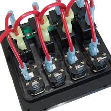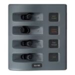 The Bluesea Systems 4374 water resitant 4 position panel, is designed for open cockpit and flybridge applications, using switches to complement the existing controls commonly used on many boats. Its rugged design idelly handles above deck conditions including salt spray, rain, hose washdowns as well as momentary immersions, utilising its water tight mounting gasket. ON indicating LEDs are embedded in all switches. The panel can be used on both 12v and 24v systems, with a maximum operating voltage of 24v DC. Switch rating 20A @ 12v DC and 15a @ 24v DC. Its circuit breaker rating is 15A, and the fuse holder rating is 20A Max (15A fuses included) Green LED’s illuminate circuit labels. The panel front is rated IP67, when properly mounted with watertight mounting gasket. The dimensions of the panel are: width 108mm, height 109mm and depth 89mm.