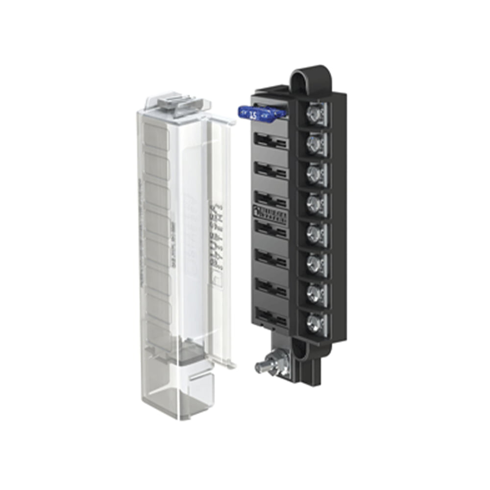 Bluesea Systems ST Blade Compact Fuse Block 8 circuit. Provides surface mount protection for ATO/ATC fuses. Has a single side entry wiring solution. The ignition is protected for use in a gasoline engine compartment. It is ingress protected to IP66, for protection against powerful water jets, and ignition protected to ISO 8846, SAEJ1171 when the cover is secure. The block has Tin-plated copper buses and fuse clips, and has a maximum operating voltage of 32a DC, maximum operating Amperage 30 Amp per circuit, maximum operating Amperage 100 Amp per block. Will accept both ring or snap type terminals.