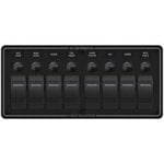 The Bluesea Systems Contura 8371 water resistant 8 position panel, is designed for open cockpit and flybridge applications, using switches to complement the existing controls commonly used on many boats. Its rugged design ideally handles above deck conditions including salt spray, rain, hose washdowns as well as momentary immersions, utilising its water tight mounting gasket. ON indicating LEDs are embedded in all switches. The panel can be used on both 12v and 24v systems, with a maximum operating voltage of 24v DC. Switch rating 20A @ 12v DC and 15a @ 24v DC. Its circuit breaker rating is 15A, and the fuse holder rating is 20A Max (15A fuses included)