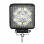 The Super Bright Square 9 x 6W COB LED Work Lamp offers 4500 lumens, low current draw (2.8 Amp), IP69K protection, and a 5000-6500K color temperature. It features a black powder-coated aluminium case and stainless steel bracket.