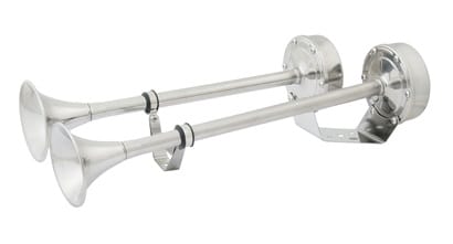 The Marinco XLP trumpet horn features a 100% stainless steel exterior, Type 304 diaphragm, and over-molded motor cover for added protection. With a 5-year warranty, it delivers 123 dB(A) at 1 meter, a 5-amp maximum draw, and frequencies of 370Hz and 310Hz.