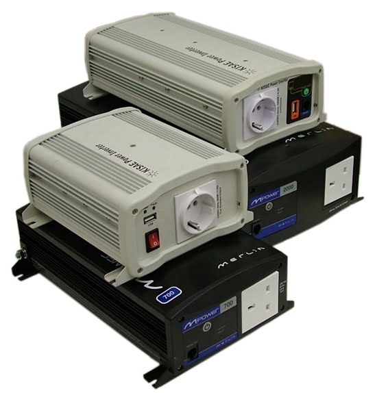 DC to AC inverters simply and silently convert 12 or 24V DC battery power to 230V AC mains electricity.