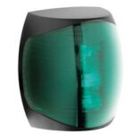The Osculati Sphera II Starboard LED Navigation Light is type-tested for boats up to 20m. It features a watertight black plastic housing, 112° beam angle, 12/24V voltage, and comes with 2 meters of marine-grade cable.