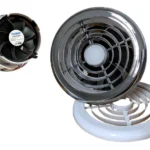 The DC Fan is a compact 12V extractor fan with an integral halogen light, ideal for marine and leisure applications like galleys, showers, and toilets. It features a long-life motor, easy installation, and is available in chrome or white finishes.